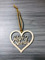 Personalized wooden heart-shaped with name  Christmas hanging décor, designed to celebrate love and togetherness with a simple yet elegant touch.This beautifully laser-cut wooden ornament features a heart-shaped design with the names gracefully engraved in the center. The fine craftsmanship highlights smooth edges and a clean finish, showcasing the natural beauty of the wood.It comes with a golden hanging cord, making it easy to display on walls, doors, gift boxes, or as a decorative piece for weddings, anniversaries, or Valentine’s Day. The heart outline and intertwined names symbolize love and unity, making it a perfect keepsake or romantic gift.
